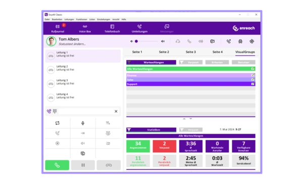 Fügen Sie Ihrer Swyx Lösung ein effizientes Warteschlangenmanagement hinzu. Eingehende Telefonate können so zuverlässig angenommen und in ausgewählten Gruppen von Mitarbeitern bearbeitet werden, so dass Wartezeiten für Ihre Kunden auch in Spitzenzeiten oder bei personellen Engpässen minimiert werden. Die Zustellung der Gespräche erfolgt nach individuell festgelegten Regeln. Das integrierte Dashboard gibt Ihnen jederzeit einen Überblick über alle Warteschlangen inklusive Anzeige der persönlichen Statistiken und Performance der gesamten Gruppe, Anzahl der Anrufe, die durchschnittliche Wartezeit der Anrufer und mehr.